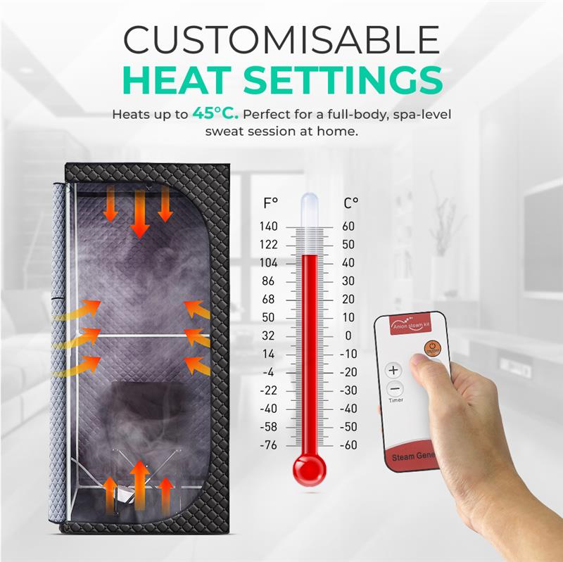 The sauna heats up to 45°C (113°F), with adjustable settings to suit your comfort level.